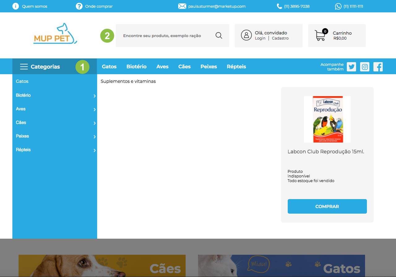 - Meu carrinho: local onde você controlará os itens e quantidades dos produtos.